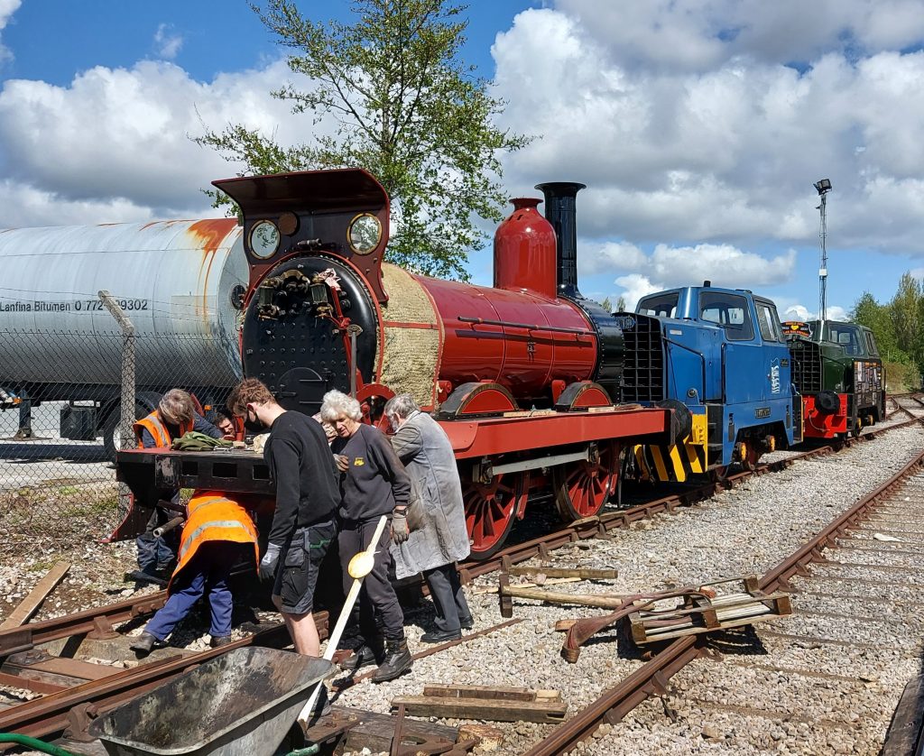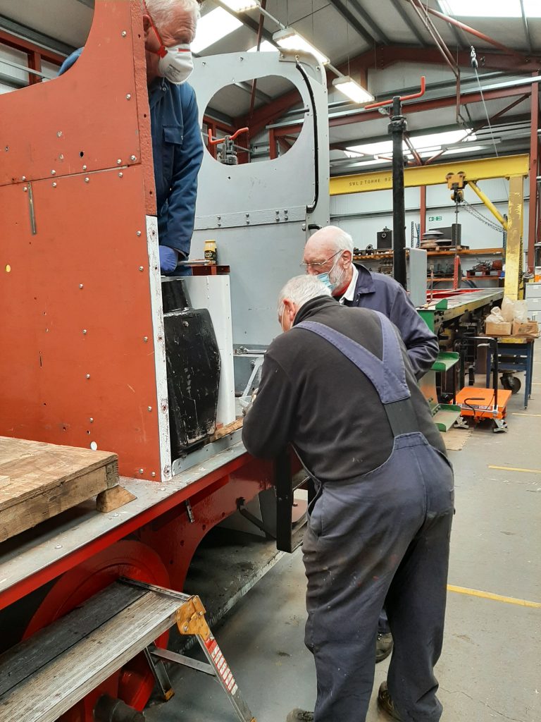Last Wednesday saw another welcome step forward in the overhaul of Furness Railway No. 20. With the assistance of the Ribble Rail staff, FR 20 was pulled out of the FRT shed to enable the hi-ab on the self propelled TRAM to lift into place the dome cover and cab spectacle plate. Tim is seen wielding a spanner during the course of tightening up the nuts holding the spectacle plate in position.