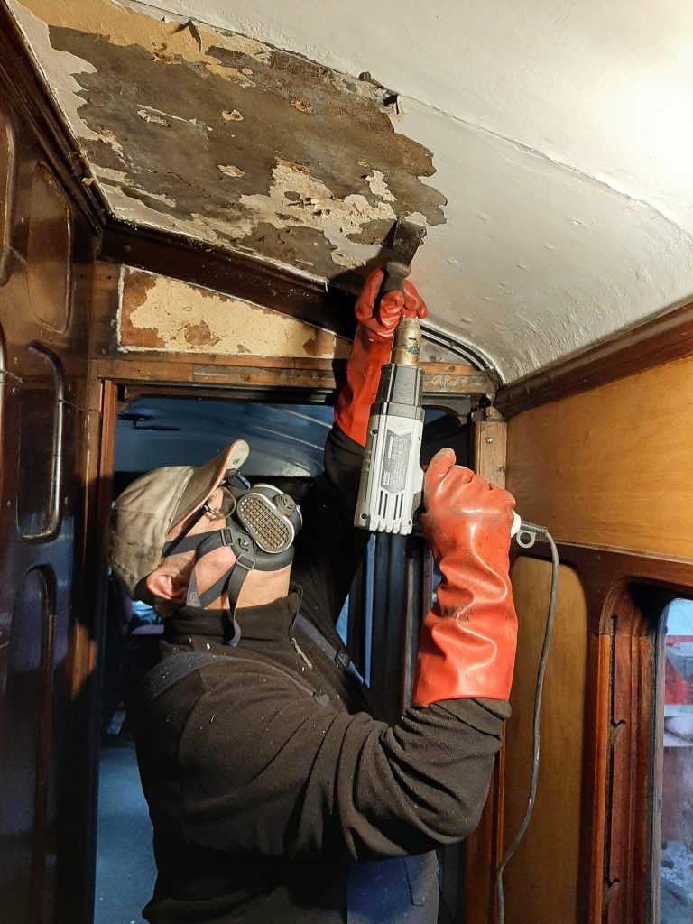 Inside the coach John Davis has been removing old paint from the corridor ceiling.