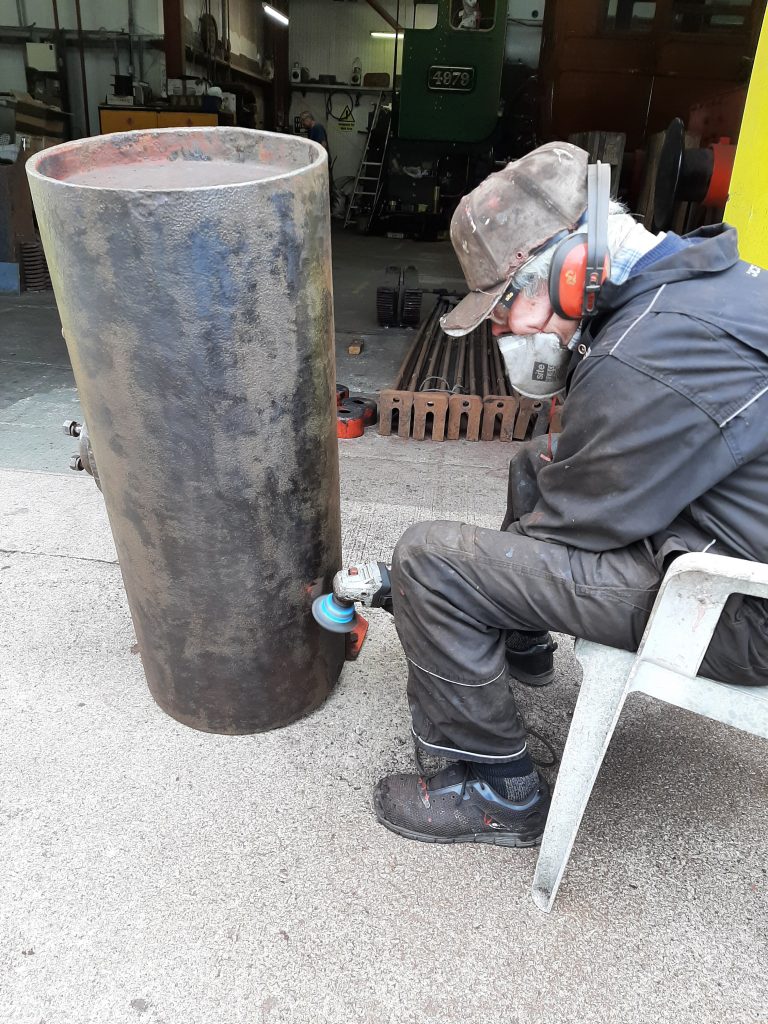 Following the issue of a new cup wire brush to Fred last week, he has been making best use of it by removing old paint and rust from the reservoir on 5643’s vacuum brake system.