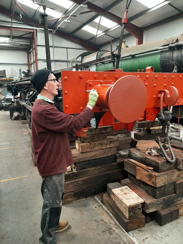 Once he had finished his work with the fire pump, Jon Dixon took on painting 5643’s buffer beam with undercoat red.